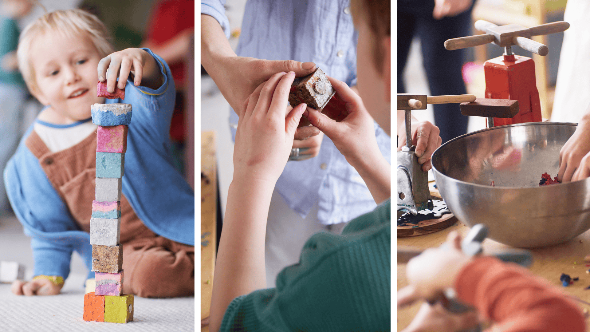 Cubcho is built on the philosophy that less is more. With just old paper and water, children create their own building blocks to play with. By adding colors, spices, seeds, or natural finds, they make thrilling discoveries and keep asking for more. Cubcho lets children take charge: experimenting, making design choices, mastering the tool, and finding their own rhythm. Along the way, they focus, connect with materials, and enjoy sustainable making through self-led play.