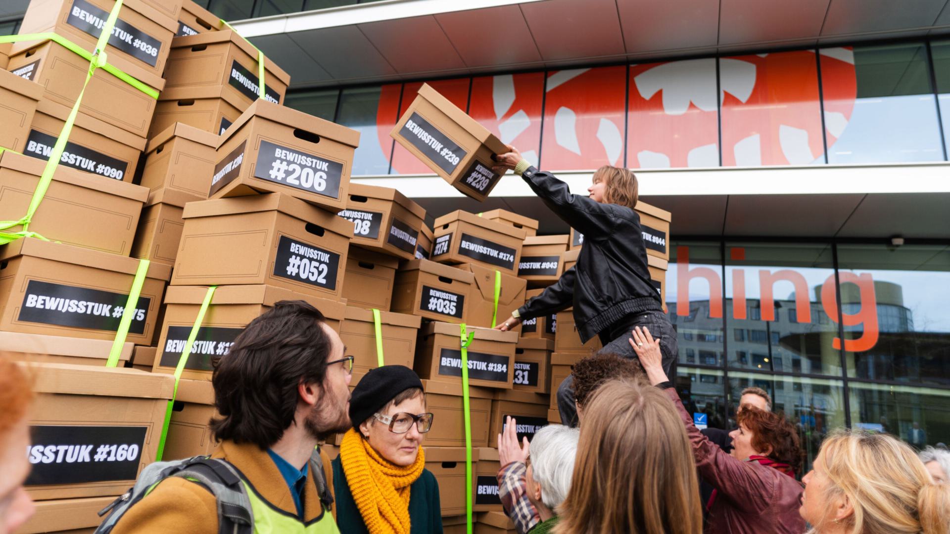 Over 150 changemakers carried a mountain of boxes with 10,000 pages of evidence from Bijlmer Arena to ING HQ. The installation by artist Pinopotato (Pauline Wiersma) and Milieudefensie volunteers marks the official legal start of the climate case against ING.