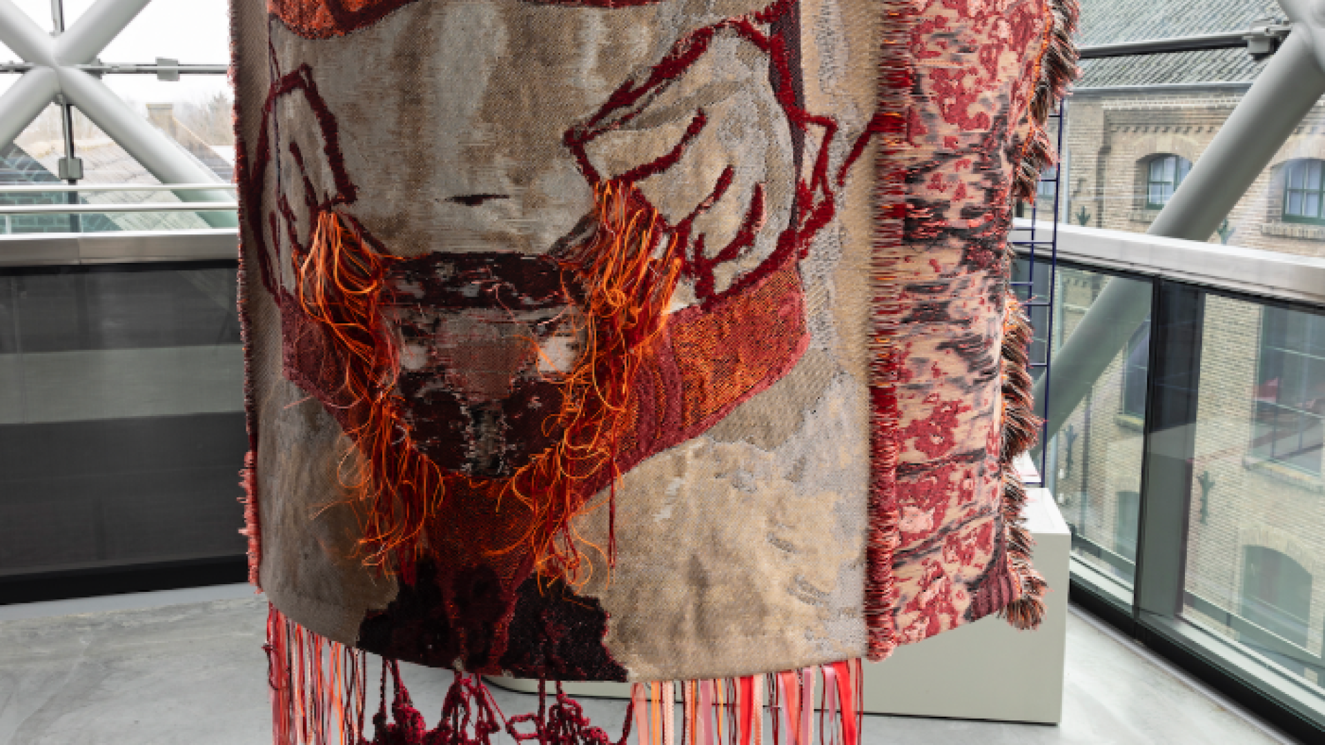 Entangled in Adhesions tells Sammies personal story about years of frustration due to not being taken seriously by medical professionals about problems with her menstrual cycle. Central is a woven tapestry that symbolizes the pain and challenges that many people with a uterus face. It evokes the feeling that forces outside of their body are pulling at them, as if