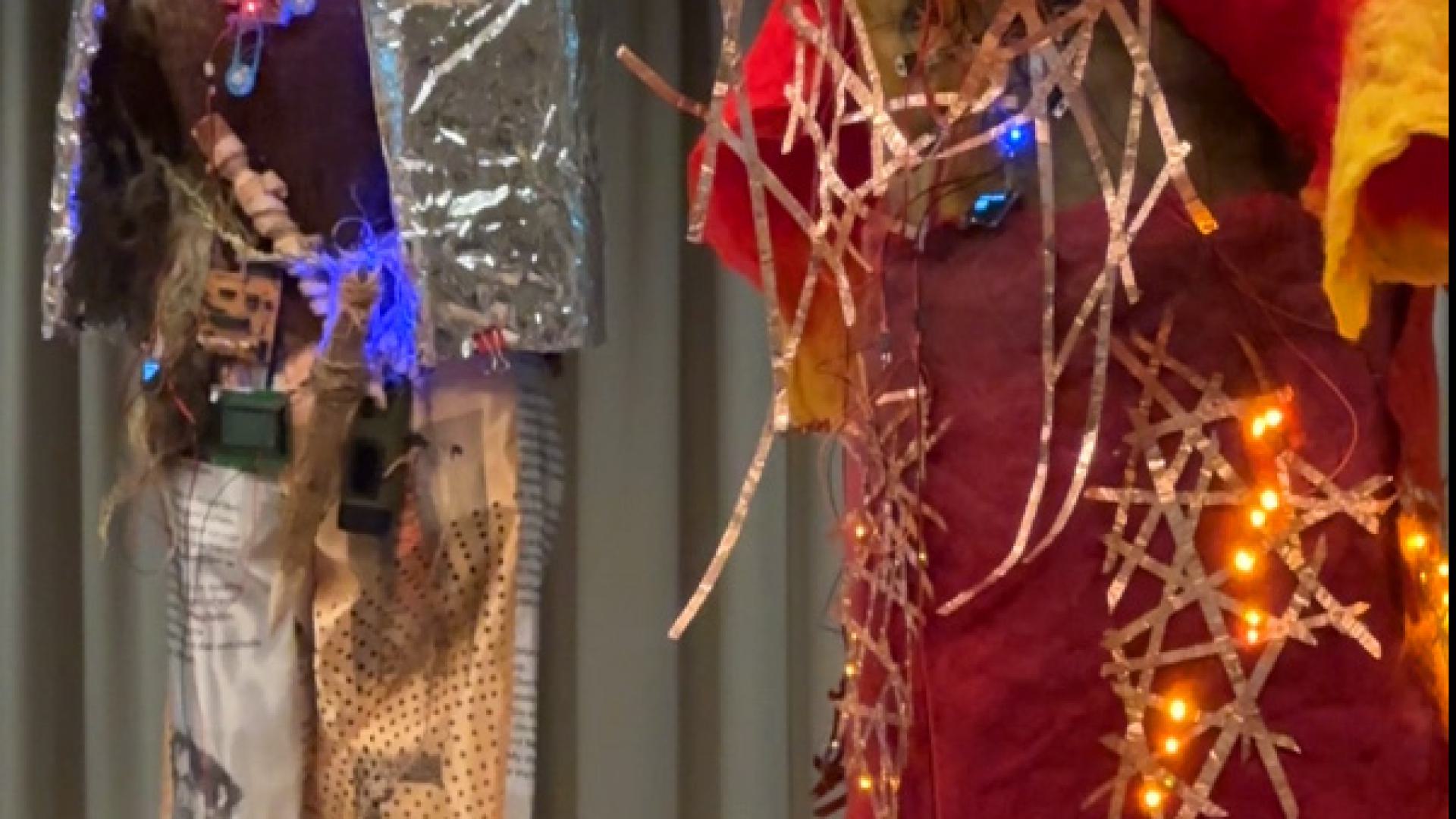 Abandoned cardboard, felting, recycled fabrics, flint, copper and bronze tools next to microcontrollers, leds, displays.