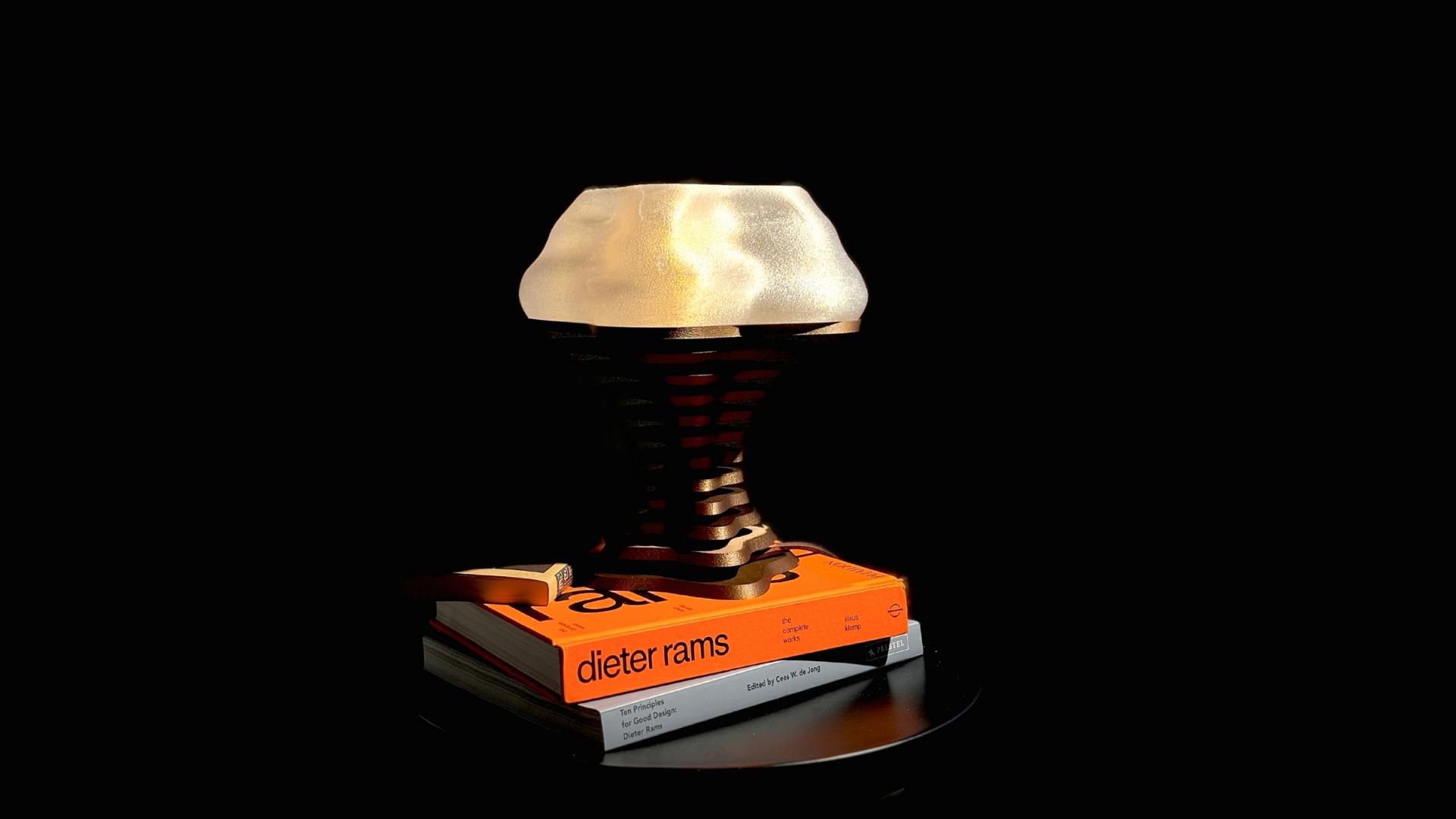 Every piece is printed in Amsterdam from a high-grade PLA biopolymer blended with recycled wood fibres and PET-G recovered from drinks bottles. The composite is lightweight and can be re-granulated in our own studio. Worn shells can be returned to us for shredding and re-extrusion. An NFC tag embedded in each base links to a digital passport recording material origin, print parameters and a unique ID, so every lamp carries a verifiable identity and owners become stewards, not just consumers.