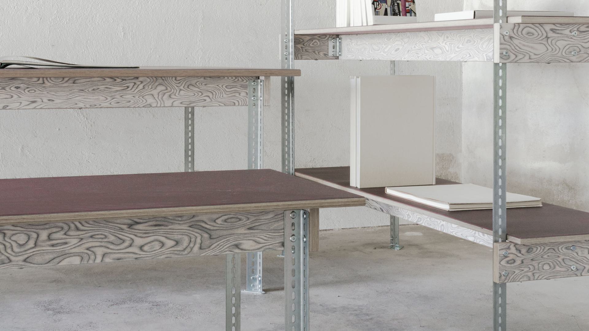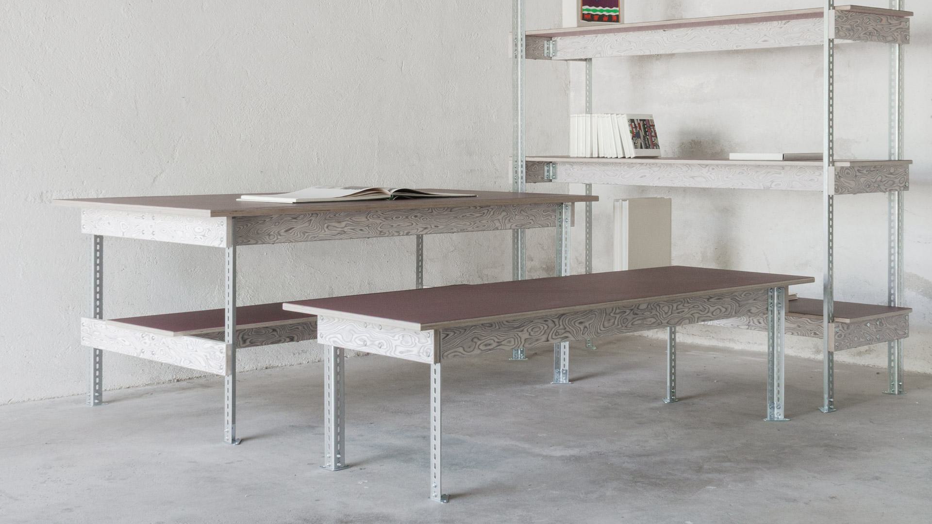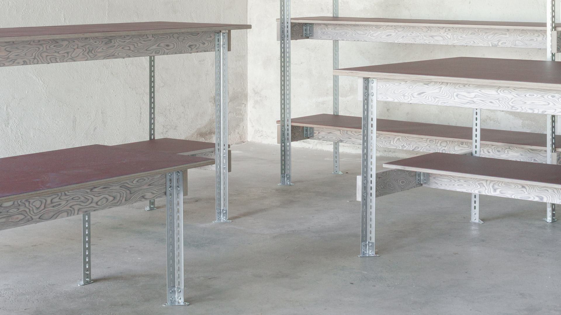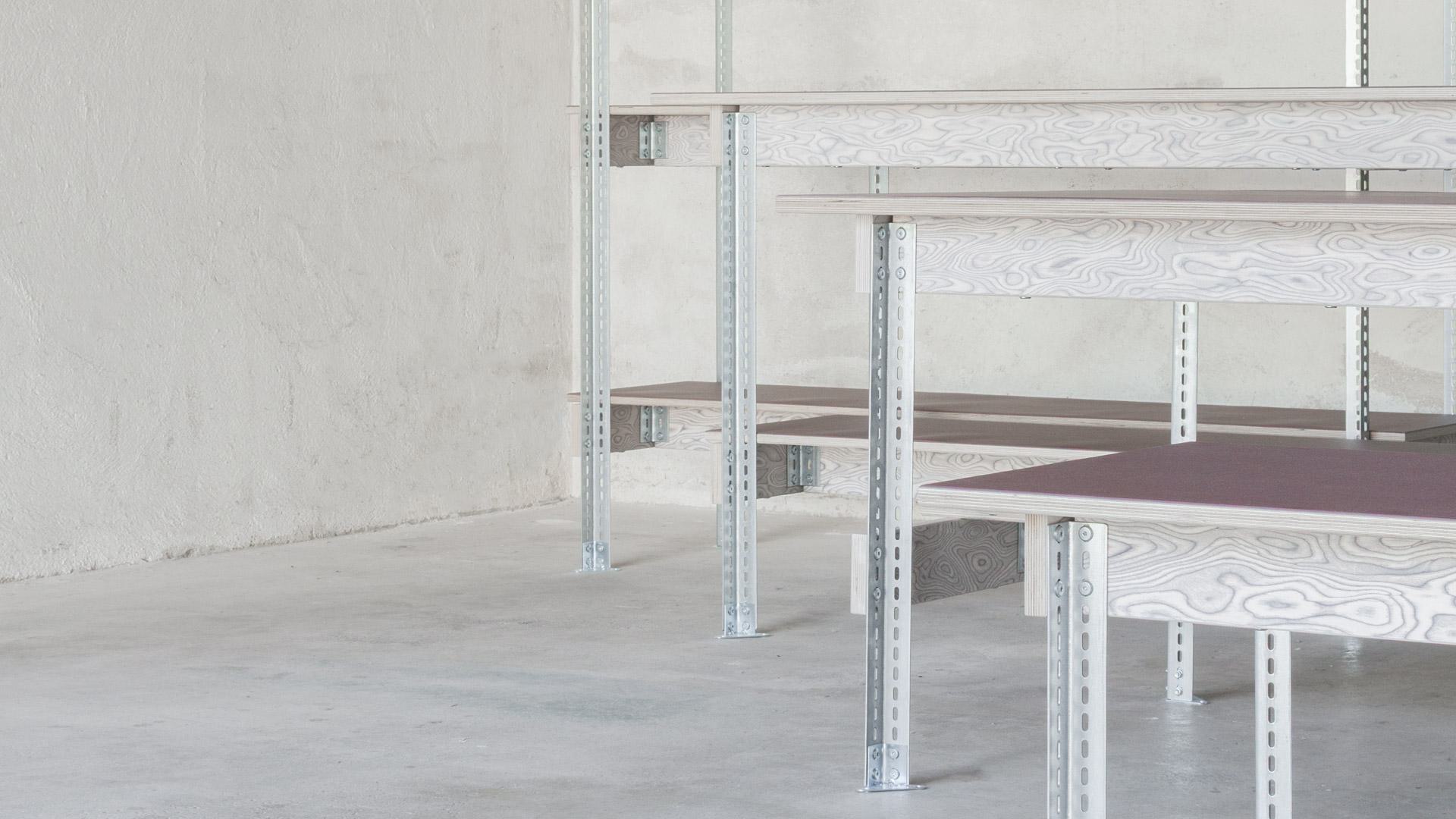 Taking inspiration from industrial shelving racks, a hybrid modular system of standardized steel profiles and wooden elements forms the basis for the series. Diverse standalone pieces or complete collections with different proportions and functions, adaptable and scalable throughout their use, can be individually configured – varied, while coherent.