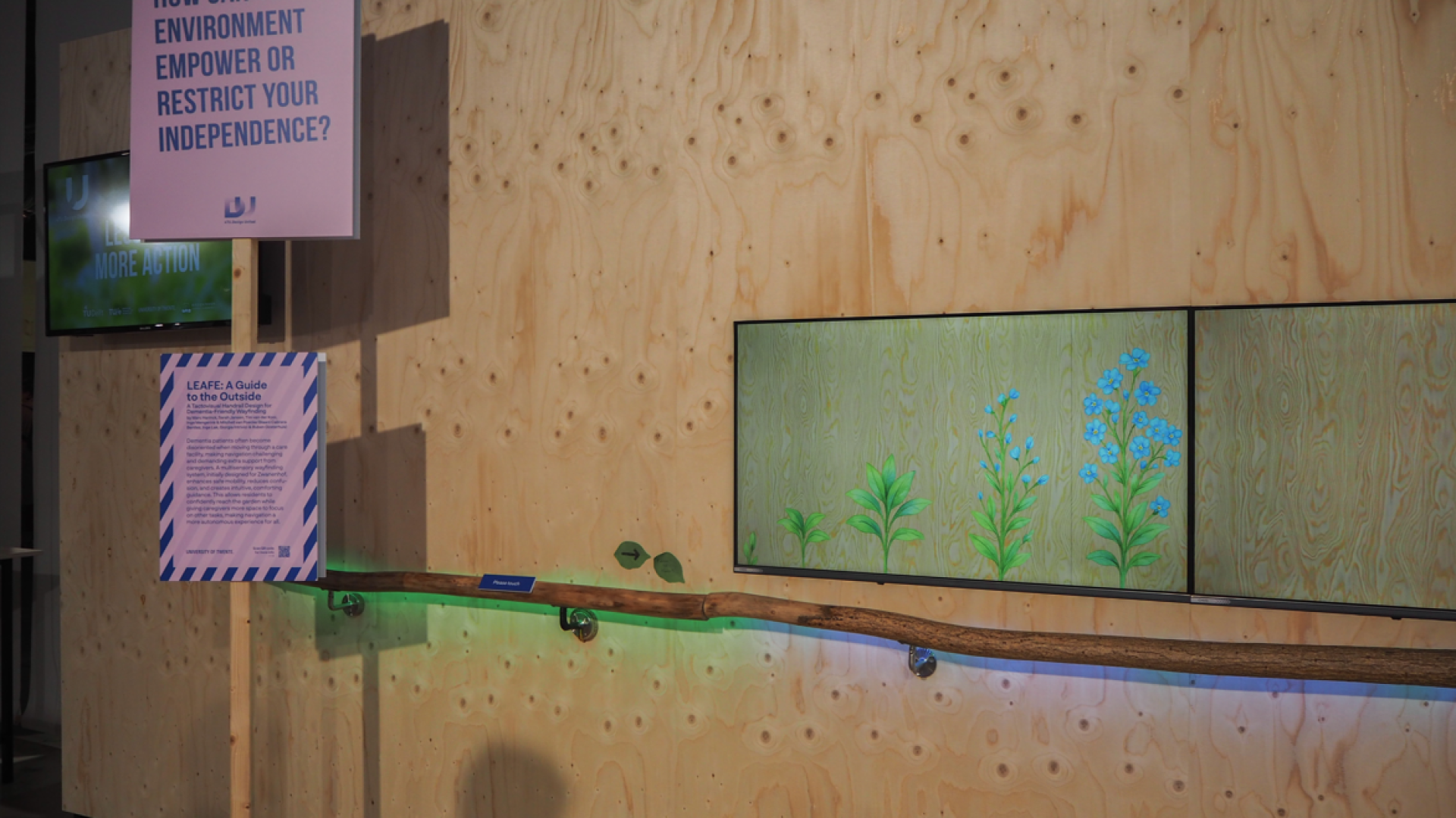 The biophilic handrail features an evolving wood texture that becomes increasingly pronounced as users approach the entrance to the garden. Beneath the rail, an ambient, pulsing green light provides subtle directional guidance. Additionally, a projector casts garden-themed vegetation onto the wall, with the projected visuals growing larger as users move closer to the garden entrance. This provides continuous sensory feedback through the handrail, while maintaining its primary safety function. The combination of tactile, visual, and interactive cues, reinforce the sense of wayfinding in the right direction. As a result, individuals may require less assistance from caregivers to navigate independently toward the garden.