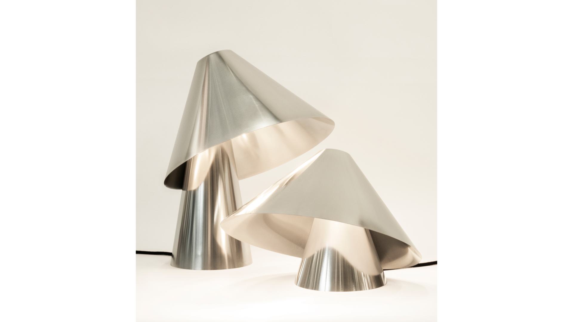 Elepé is born as a single sheet of aluminium - the shape of which reminds of a LP disk. Through the simple act of bending, functionality is poetically added to the material, turning the flat sheet into a table lamp. Carefully considered proportions result in a minimal, sculptural object for the home.