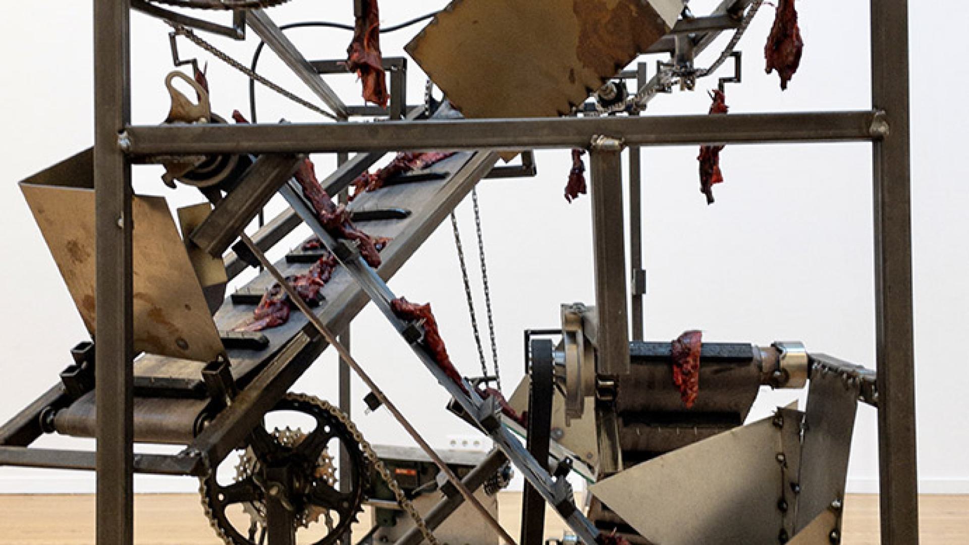 Rotating motors, chains, and gears move meat through a factory system. The installation exposes the meat industry: raw and mechanical. You are invited.