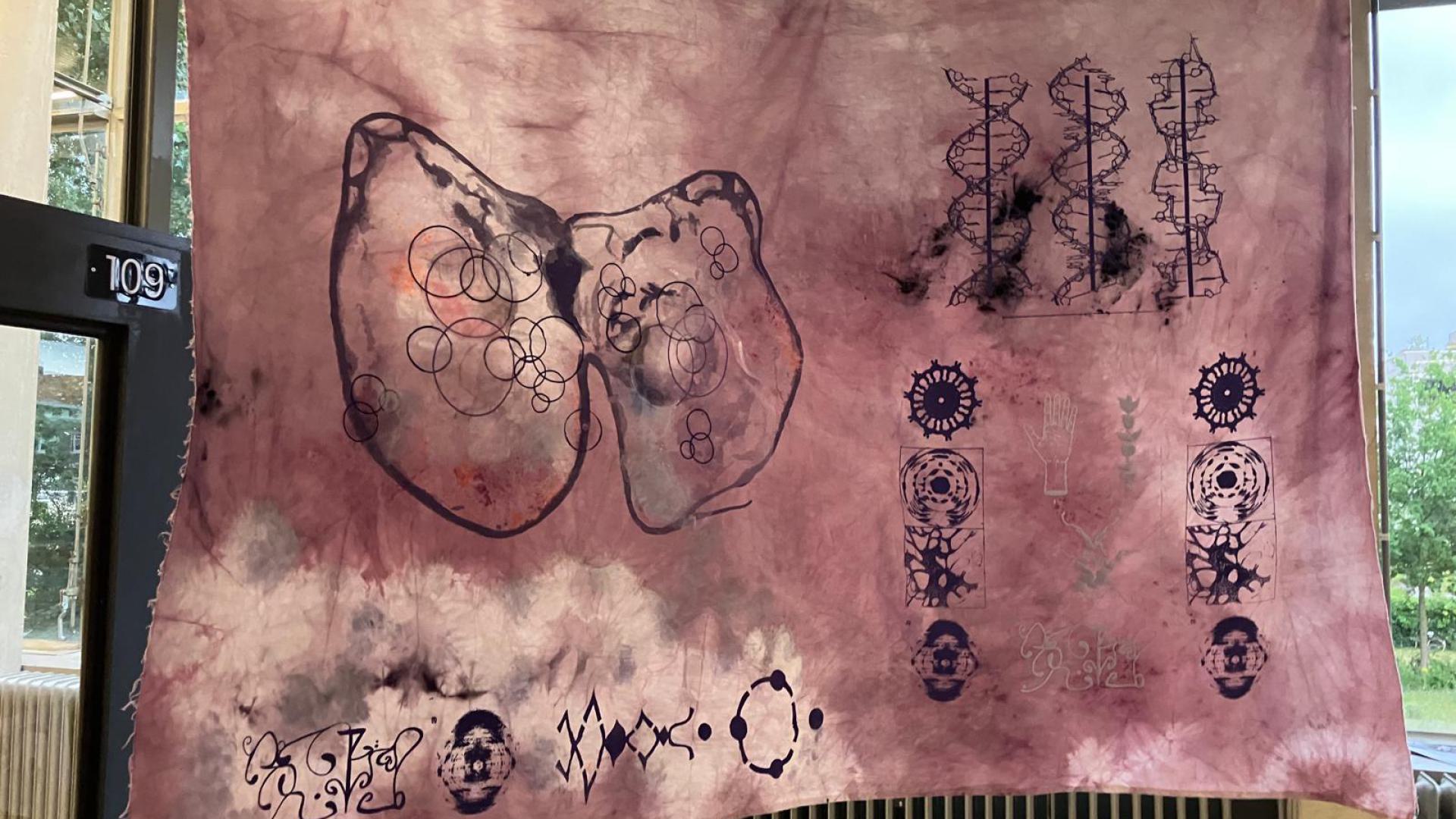I created screen prints and used embroidery on fabric which I hand dyed using natural pigments such as cochenille and logwood. Each thread is a root, each image a mycelial map. I’m mapping the island’s wounds and migrations, its collapsed cities and blooming futures. I gather the traces—oral echoes, ancestral symbols, unspoken words—and spin them into a living tapestry. My voice guides you through the tale of this long-lost island.
