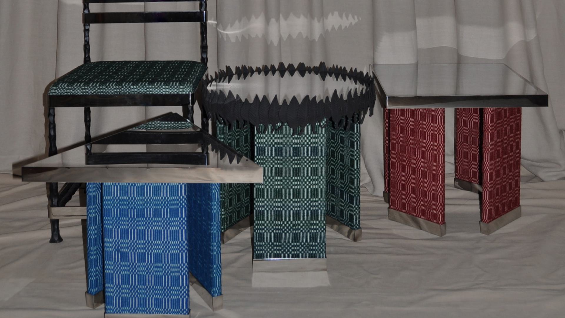 This collection is inspired by the geometry of birth charts and the angular relationships between planets, which in astrology carry potent energies. It explores the tension between vertical and horizontal planes, expressed through contrasting materials: stark steel and tactile, natural wool. This series of side tables use simple geometric forms to convey symbolic meaning, balancing structure, materiality, and esoteric references. The triangle embodies equilibrium and flow, the square explores tension and antagonism within a cubic volume through the offset tabletop and legs, and the circle represents unity and harmony. It is expressed in a flawless form adorned with hand-hammered metal leaves, also in circular mirror version. The upholstery on the legs, featuring a subtle traditional geometric pattern in primary colours, unifies the collection, reinforcing visual stability and simplicity of form while connecting materiality and symbolism.