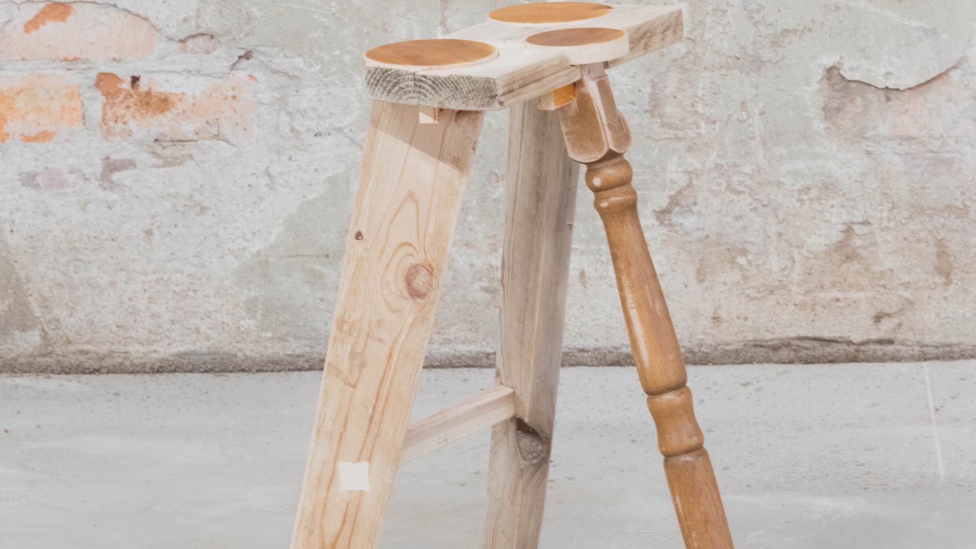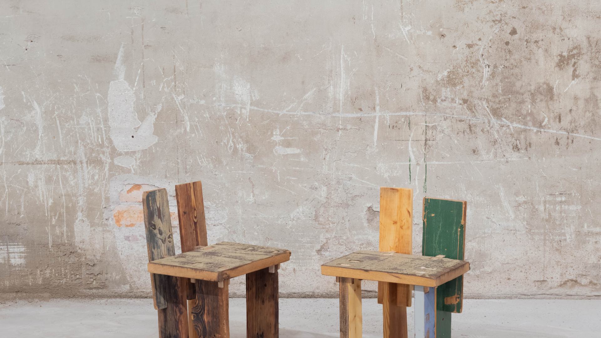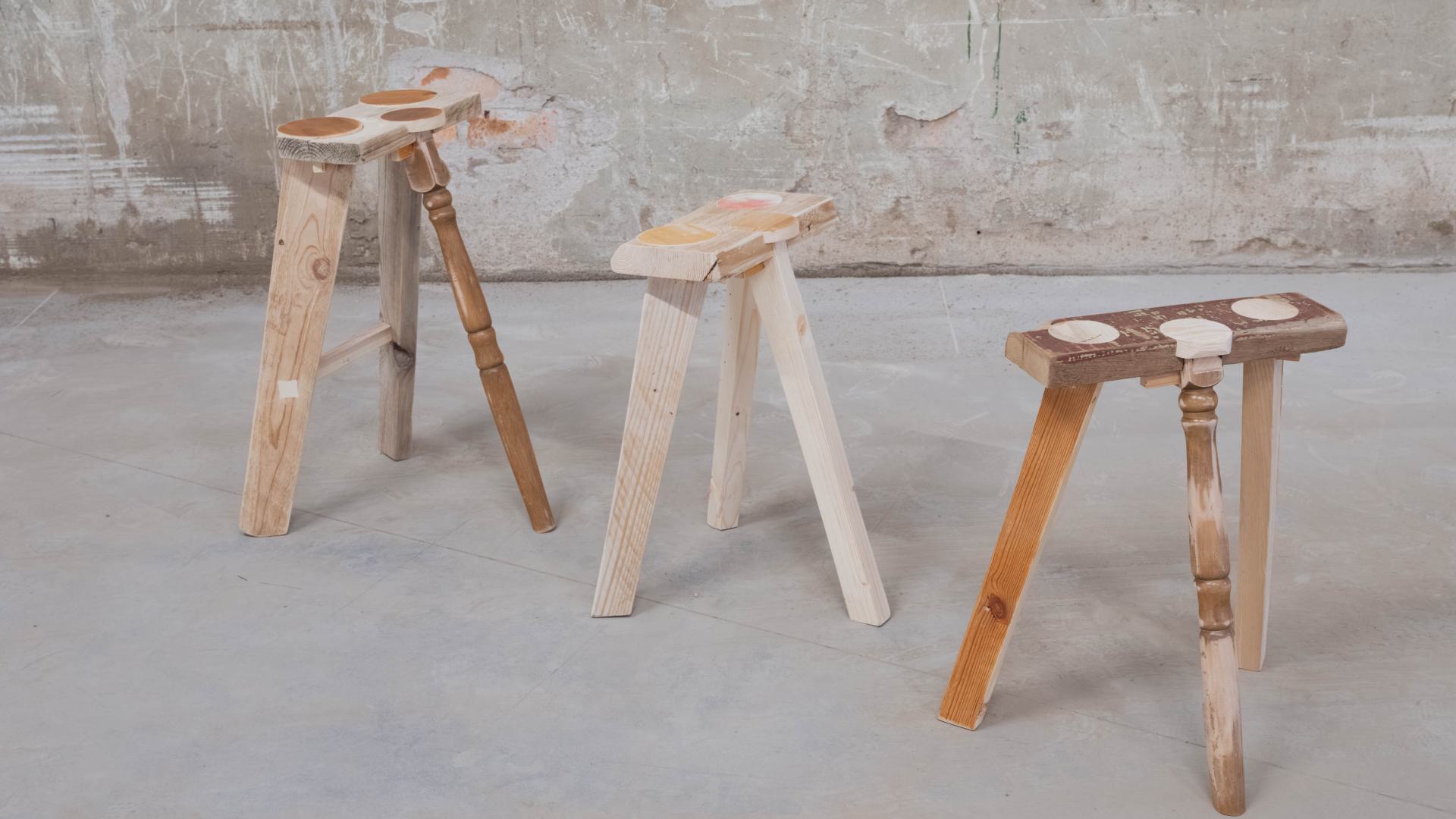 The waste wood pieces were collected in Bernd-Klebs GmbH: a recycling centre in Berlin. Each stool is built from wood found in there, making use of its irregular shapes, sizes, and histories.