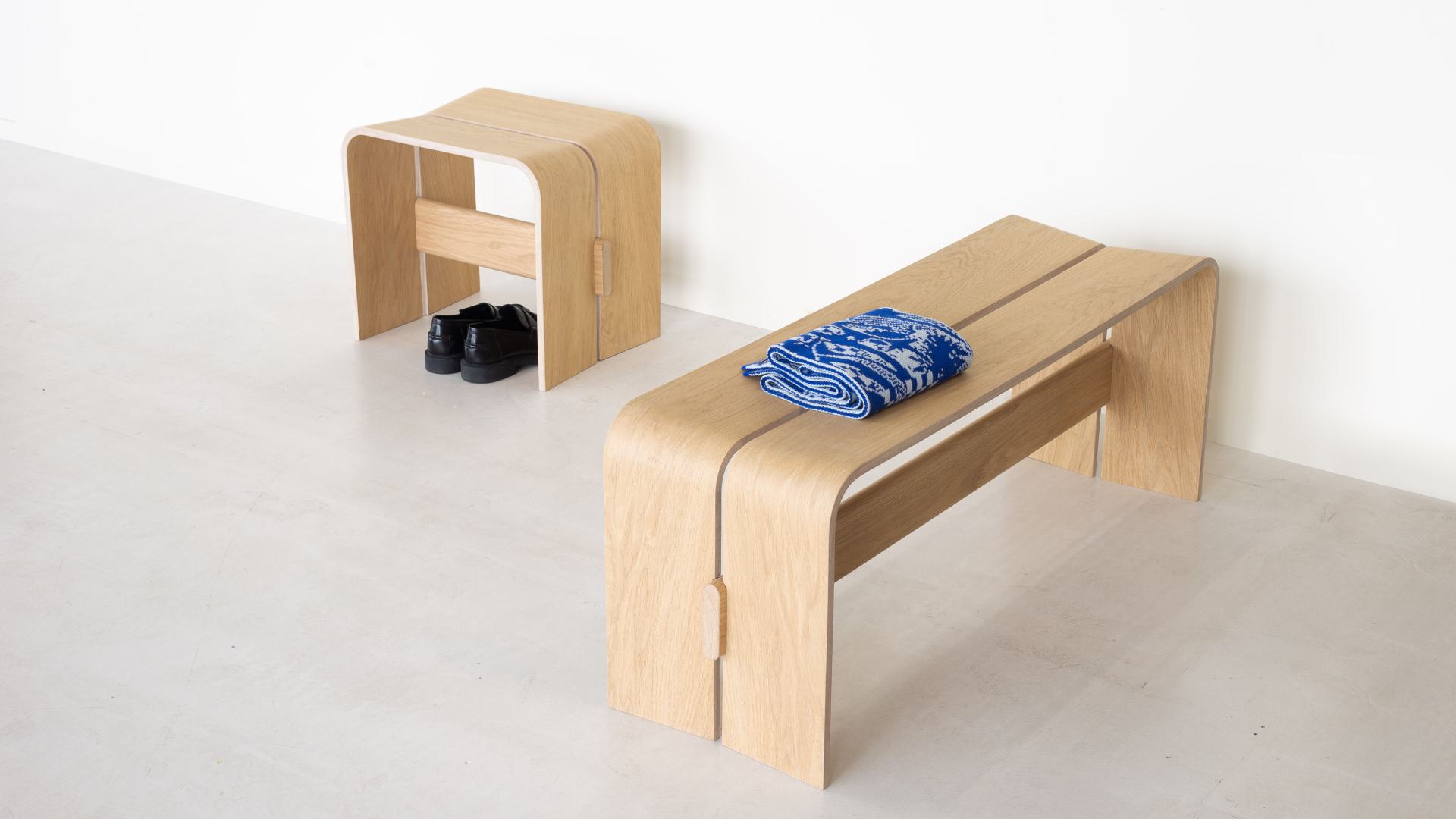 The Tercet Bench offers compact seating suited for a dining table or hallway — for short moments like putting on shoes or having a quick coffee. The Stool shares the same construction in a smaller form, serving as an occasional seat or a small side piece within the home.
