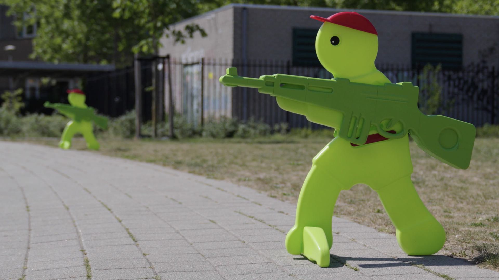 Victor Veilig is the bright green figure that warns of children playing. Now this symbol of care and safety warns of war.