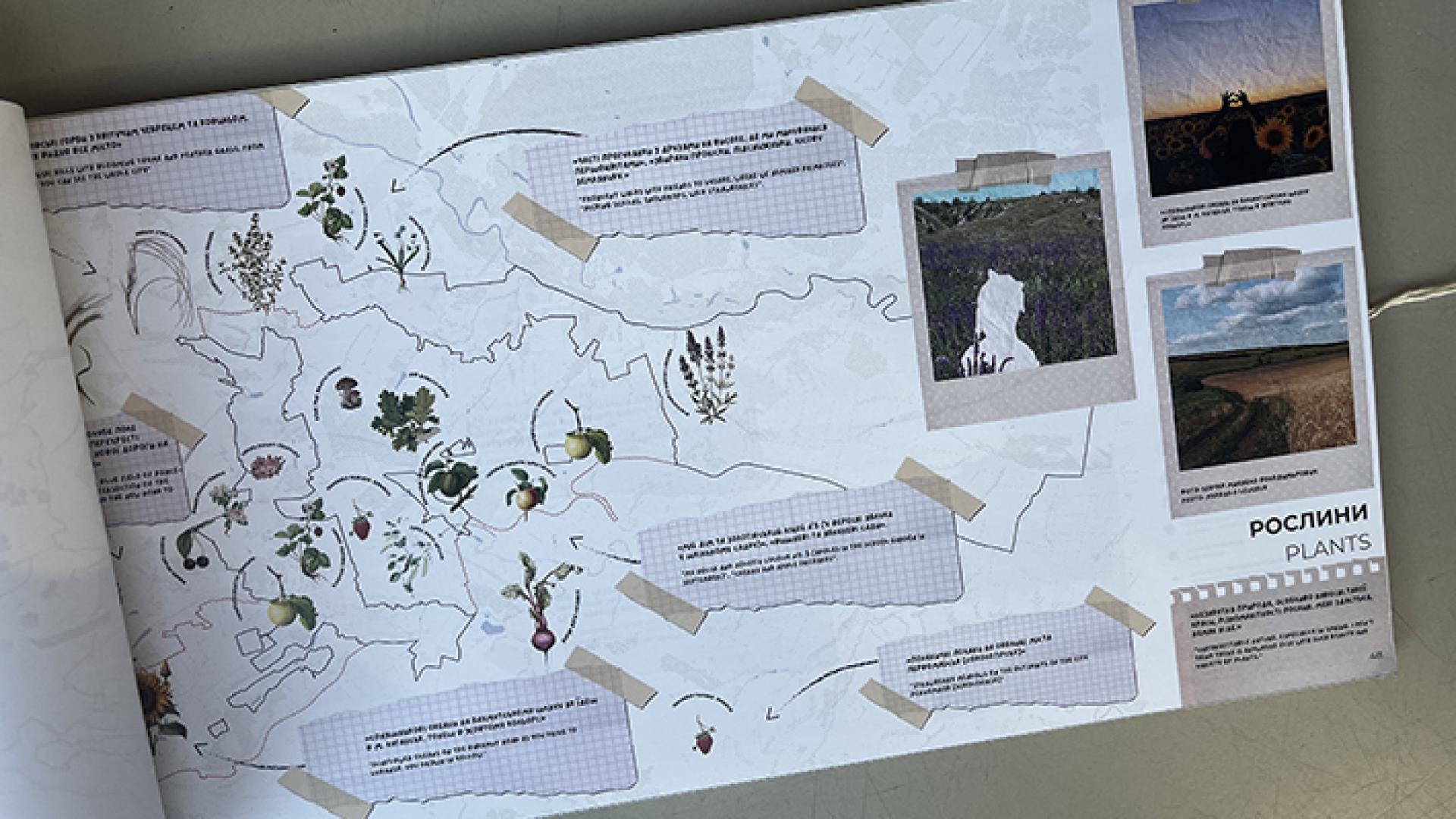 As urban designer, Sofiia Bondar worked on the installation for the occupied and displaced community of Hirska. When you ask refugees what is needed to return, they all say: a house, a job, safety. Asking them what they miss, they say: people, nature, culture. Silk screen maps on Carpathian hemp.