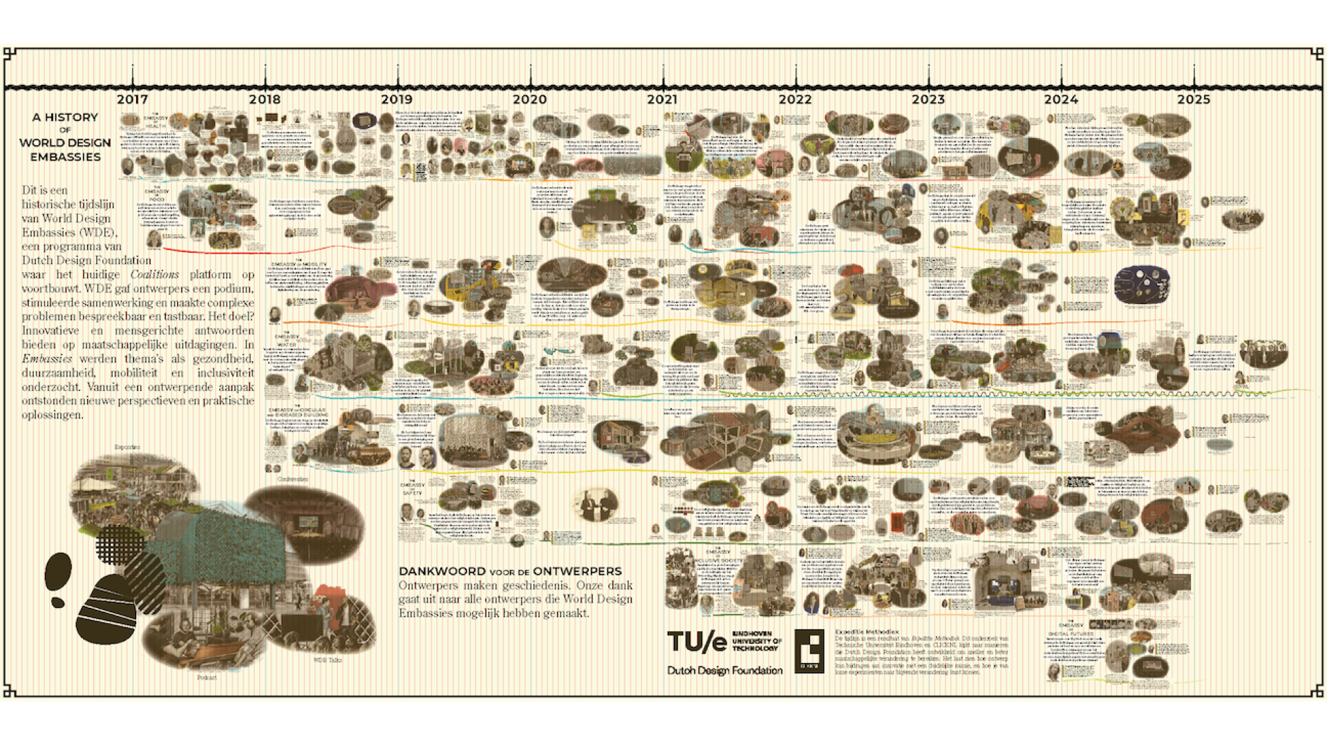 This is a historical timeline of the former World Design Embassies programme (2017-2024, now Coalitions) organised by Dutch Design Foundation. It shows how design projects unfold over larger timescales. How does the work of designers hang together with larger historical movements? How can the work of individual designers contribute towards shared missions? How should we deal with the tension between the desire for societal impact and the explorative attitude of designers. What is missing from this history?